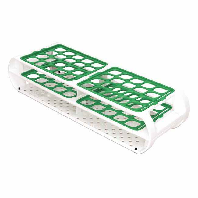 Innovative, split-frame racks hold up to two different sized tubes in the same rack, allowing students to quickly switch grids to hold other sizes as needed.10mm to 30mm diameter test tubes fit in five color-coded grid insertsThree-tier rack holds tubes securely in placeRubber feet keep racks from sliding on lab desk and provide secure stacking while in storageChemical resistant polyoxymethylene plastic rack frame and grids can be cleaned with mild detergent, ethanol or isopropyl alcohol; autoclaved at 121°C (250°F)More compact and less expensive than multiple racksOrder InfoEach rack includes a set of grids in one size; grid sets in alternate sizes can be purchased separately (See Cat. Nos. S04600 through -604). Rack frame overall dimensions: 12 1/2 × 4 3/8 × 2 5/8 in. (31.8L × 11.1W × 6.7cmH).