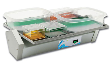 One touch operation—just press the power switch. The BenchBlotter™ is optimized for common molecular lab applications such as blot washing, gel staining/destaining, and hybridization applications. This economical 2D rocker packs a sizable work space onto a lightweight and compact design that is easy to carry and is cold-room and incubator safe.