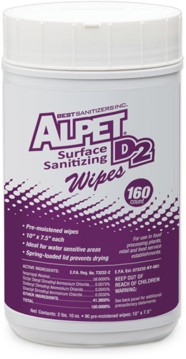 Alpet D2 Surface Sanitizing Wipes are a ready-to-use, no-rinse, lintless wiping system for food contact surfaces. Able to clean and sanitize, Alpet D2 Surface Sanitizing Wipes are available in a heavy duty 90 count wipe and a 160 count medium duty wipe. As with all Best Sanitizers wiping systems, the spring-loaded lid closes on its own to prevent the drying of wipes, helping to eliminate unnecessary waste.