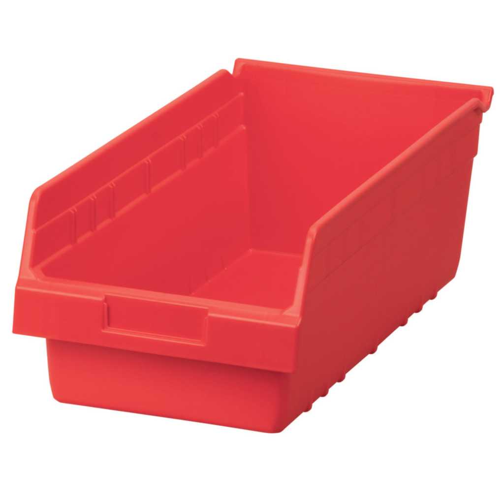 ShelfMax Bin 6in Red^ ShelfMax Bin, Material: Plastic, Color: Red, Heavy-duty, Reinforced Side ribs, Multiple divider slot, Built-in rear hanglock, One-piece construction is waterproof and unaffected by grease or oil, Inner dimension: 5-15/16x16x6-5/8in, Outer dimension: 6x17-7/8x8-3/8in