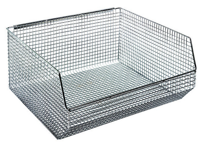 Mesh Bin Cf757^ Mesh Bin, Model: Cf757, Stack & Hang Bin, Material: Wire Mesh, Colour: Nickel-Chrome, Capacity: 100 Lbs. Hang/175 Lbs. Stack, Outside Width: 16 1/4In, Outside Depth: 14 1/2In, Outside Height: 7In, Inside Width: 15 3/4In, Inside Depth: 14In, Inside Height: 6 3/4In, With Grid Patter