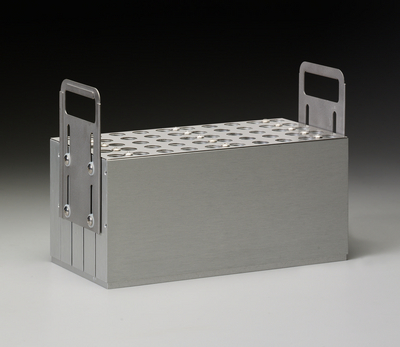 Aluminum Block 17x120mm^ Aluminum Block, Accomodates 15 ml Conical Tube, For RapidVap Vertex Dry Evaporators, Angled in the Vertex, the sample capacity is 12 ml, Handle: Stainless steel, Port diameter: 0.5cm, It is for insertion of the temperature probe to monitor temperature, Dimension: 17x120mm