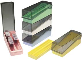 SlideFile* Storage System^ For up to 400 75x25mm microscope slides. System includes a slide box, removable tray, tinted hinged cover. Impact-resistant plastic. The removable tray has 100 individually numbered slots. Stackable. Not autoclavable. Dimensions: 8.2Wx24.5Lx8.6Hcm. Color: blue.