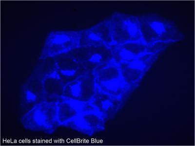 The CellBriteTM Blue Membrane Labeling Kit^ labels cytoplasmic membranes with a blue fluorescent membrane dye DiB. In combination with our other CellBriteTM membrane stains, multiple cell populations can be labeled with distinctive colors, which is useful for the study of cell-cell interactions.
