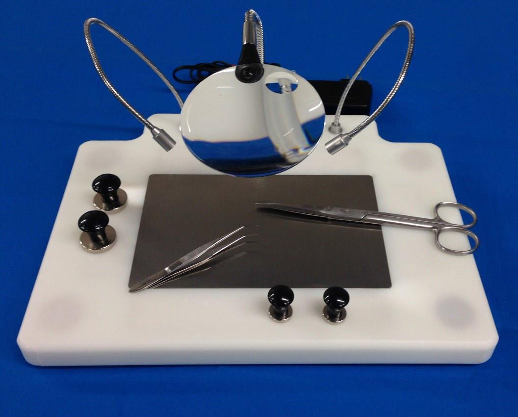 Small Animal Surgery Board^ Small Animal Surgery Board, For Mice and Rats 2 Bright Led Lights Rimless Magnifying Glass (2.3X, Inset 4X) and Magnetic Base System 100-240 Vac Power Supply Board 12X9.5in Magnetic Warming Plate 7inX4in Gel Heating Pad Limb Restraints