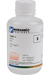 1000 ppm (µg/mL) Boron for ICP is a 125mL certified reference material set in a water matrix for stability. This boron standard is Traceable to NIST and manufactured in accordance with our stringent Quality Assurance guidelines. One year Expiration Date.