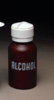 Lasting-Touch HDPE Bottle with Pump^ 8oz. Suitable for many solvents. Opaque brown bottle protects light and plastic sensitive fluids. Perfect for alcohol dispensing. Wide opening. Convenient swing lid. With alcohol imprint for demarcation.