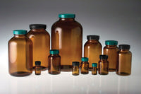 BOTTLE, AMBER GLASS WIDE MOUTH^ 500ml. Thread Size GPI: 53-400. These round, wide mouth amber glass bottles are used for storage of light sensitive chemicals. The 50ml and 120ml bottles have a black phenolic cap with a polyethylene cone shaped liner.