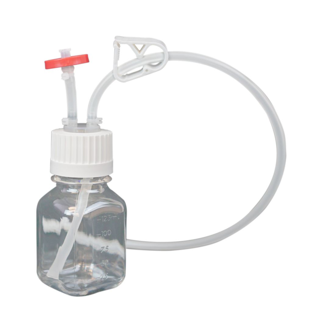 EZBio* Single-Use Media Bottle Assembly 125mL^ EZBio* Single-Use Media Bottle Assembly, Sterilized, Cap: 38-430 VersaCap*, PC, Vented with DipTube, for fluid transfer and storage, Bottle Material: PC, Tube Material: TPE, Length: 2.14 in, Width: 2.14 in, Overall Height: 8.5in, Volume: 125mL