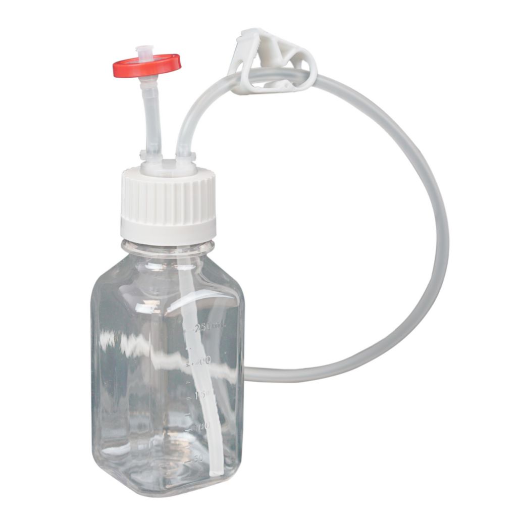 EZBio* Single-Use Bottle Assembly 250mL^ EZBio* Single-Use Bottle Assembly, Sterile Media Bottle with Tubing and Vent Filters for fluid transfer, 38-430 VersaCap, Bottle Material: PETG, Vented with DipTube, Tube Material: TPE, Length: 2.4in, Width: 2.4in, Overall Height: 9.4in, Volume: 250mL