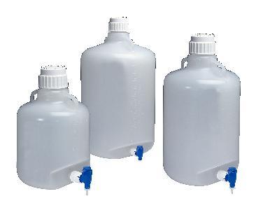 NALGENE* Carboys with Spigot and Handles, Polypropylene^ 50L carboy is useful for storing and dispensing solutions and media and for storing sterile water. Carboy can be autoclaved before refilling and has excellent resistance to chemicals. Graduated to deliver in 5L increments. 83mm cap included.