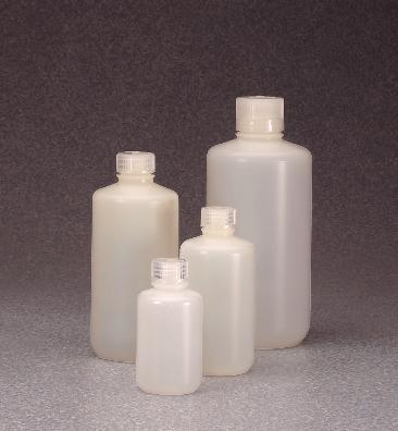 NALGENE* Bottles and Carboys, Fluorinated High-Density Polyethylene, Narrow Mouth^ 2L bottles have fluorinated inner and outer surfaces for improved barrier properties and reduced solvent absorption and penetration. Resistant to most acids, alkalies, and aggressive organic solvents. 38-430 cap.