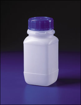 Square Bottle^ 1000mL. Leakproof design and chemical resistant. With heavy-threaded necks make good use of limited shelf space and are ideal for storing or shipping samples. Molded of high-density polyethylene with deep-shelled, blue polypropylene closures with a cork and vinyl liner.
