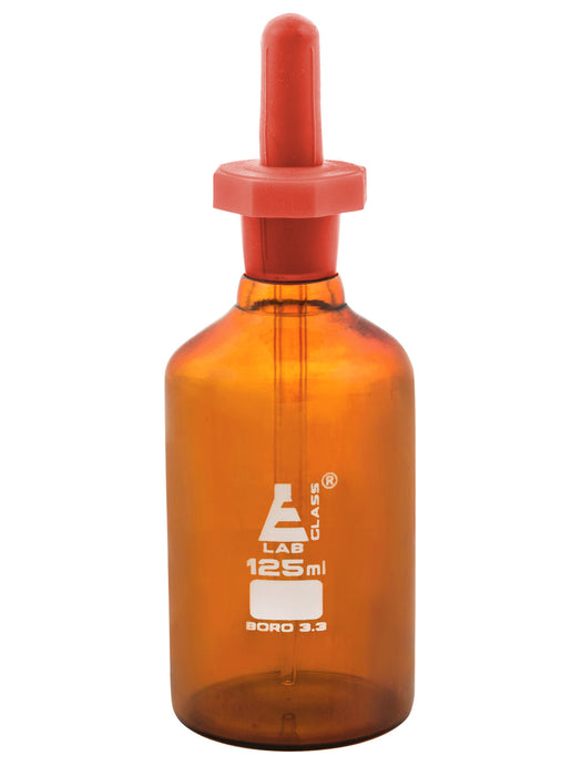 125ml (4.2oz) Borosilicate 3.3 Glass Dropping Bottle Dropping bottle is equipped with an eye dropper pipette for clean dispensing of the stored contents. The amber color glass absorbs harmful UV waves, making it useful for light sensitive contents. Three piece pipette section, comprising of a glass eye dropper, high density polyethylene octagonal stopper and dust proof head with rubber teat. 125ml (4.2oz) capacity. Suitable for a variety of applications in the household, classroom or laboratory. Excellent for chemistry applications, transferring and mixing indicators, stains or other aqueous solutions. Perfect for storing, mixing, and dispensing essential oils and other homemade concoctions. Bottle (including top) measures 5.9" tall and 2.15" in diameter.