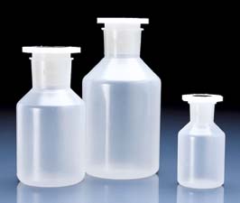 Reagent Bottle with Stopper^ Capacity: 500mL. Standard taper joint size: 45/40. 87dia.x183Hmm. Wide mouth polypropylene reagent bottle provides excellent chemical resistance to many aliphatic alcohols, aldehydes, aliphatic hydrocarbons, alkalis, and acids.