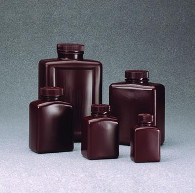 NALGENE* High-Density Polyethylene Rectangular Bottles, Wide Mouth^ 250mL, amber, leakproof bottles are ideal for storage or shipment of dry chemicals or liquids. Bottles protect light sensitive materials. Sturdy bottles will not bulge. 38mm cap included. Bottles comply with USP XXI requirements.