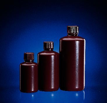Leak-Resistant Bottle, Amber, High-Density Polyethylene, Narrow Mouth^ 8mL. Ideal storage bottle. Amber in color to protect light-sensitive samples. Designed with a special pour lip to facilitate safe, clean dispensing. Polypropylene cap attached. Cap size: 20-410. Dia.xH: 25x43mm.
