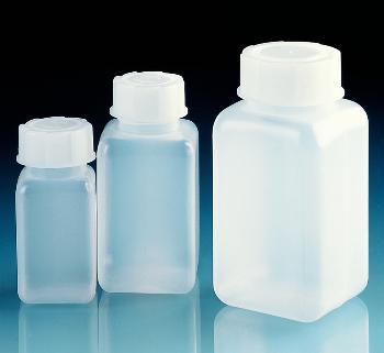 Square Laboratory Bottle^ Capacity: 500mL. Thread finish: GL45. 70Wx133Hmm. General-use low-density polyethylene wide mouth bottle comes with low-density polyethylene screw cap. Bottle provides excellent chemical resistance to aliphatic alcohols, aldehydes, alkalis, and acids.