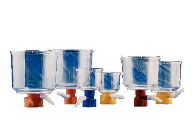Corning* Bottle-Top Filters, Sterile^ 150mL, 50mm diameter cellulose acetate membrane. Sterile, aqueous filters in polystyrene funnels attach to glass or plastic media bottles. Vacuum line attachment. 0.45um pore size. 45mm neck size.