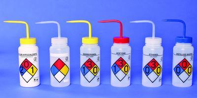 Wash Bottle 4CLR Asstd 250ML^ Variety Pack of 250ml Vented, wide-mouth Wash Bottles. Contains 1 ea Acetone, Dist.Water, Ethanol, Isopropanol, LYOB and Bleach. Bottles printed with chemical name, formula, full color NFPA codes, health hazards, CAS number, and more. 6 per pack; 4 packs per case