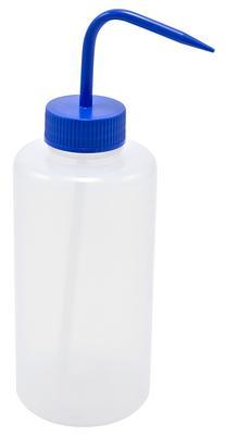 BOTTLE WASH BLUE WM 1000ML CS5^ LDPE Wash Bottle with blue wide-mouth polypropylene screw closure. Wide neck offers easy spill-free filling. The molded dispensing spout ensures a consistent, downward pointing jet. Max. temperature use of LDPE is 80C.