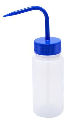 BOTTLE WASH BLUE WM 250ML CS5^ LDPE Wash Bottle with blue wide-mouth polypropylene screw closure. Wide neck offers easy spill-free filling. The molded dispensing spout ensures a consistent, downward pointing jet. Max. temperature use of LDPE is 80C.