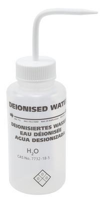 BOTTLE WASH DI WTR 500ML CS5^ LDPE Wash Bottle with white wide-mouth polypropylene screw closure. Bottle pre-printed inDeionized Waterin. Wide neck offers easy spill-free filling. The molded dispensing spout ensures a consistent, downward pointing jet. Max. temperature use of LDPE is 80C.