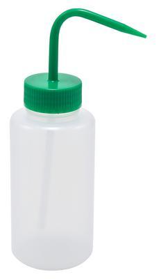 BOTTLE WASH GRN WM 500ML CS5^ LDPE Wash Bottle with green wide-mouth polypropylene screw closure. Wide neck offers easy spill-free filling. The molded dispensing spout ensures a consistent, downward pointing jet. Max. temperature use of LDPE is 80C.