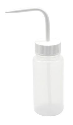 BOTTLE WASH WH WM 250ML CS5^ LDPE Wash Bottle with white wide-mouth polypropylene screw closure. Wide neck offers easy spill-free filling. The molded dispensing spout ensures a consistent, downward pointing jet. Max. temperature use of LDPE is 80C.