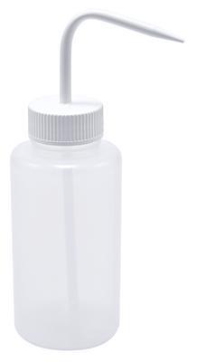 BOTTLE WASH WH WM 500ML CS5^ LDPE Wash Bottle with white wide-mouth polypropylene screw closure. Wide neck offers easy spill-free filling. The molded dispensing spout ensures a consistent, downward pointing jet. Max. temperature use of LDPE is 80C.