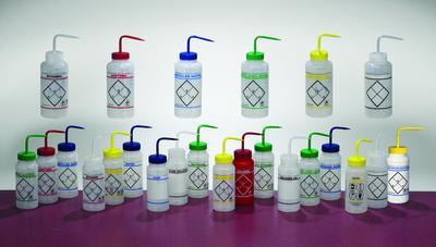 Wash Bottle WM Ethanol 1000ML^ Safety labeling indicates chemical name and formula, NFPA codes, health hazards, Chemical Abstract System (CAS) number, and suggested protective clothing and equipment. LDPE bottles have wide mouths for easy refilling. 6 per pack; 2 packs per case