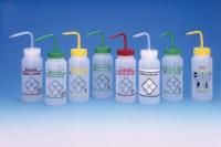 Wash Bottle Vent Ethanol 500ML^ Unique valve eliminates dangerous chemical drips. Safety labeling indicates chemical name and formula, NFPA codes (Fire Hazard), health hazards, Chemical Abstract System (CAS) number, and more. LDPE bottles with PP closures