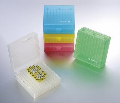Cryogenic Storage Box 81-well^ Cryogenic Storage Box-PP, 100-well, 2 in, for mechanical freezers/liquid nitrogen, Made of tough polycarbonate for use with temperatures from -90C to 121 C, Vented, allowing rapid cooling, full drainage, 3-hinged, alphanumeric grid on Lid, Dimension: 5.55x6.05x2.15 in