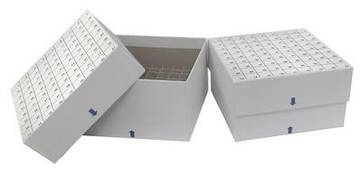 Here is the corrected text: These Mechanical Cryogenic Freezer Boxes with dividers are constructed of durable fiberboard with a protective moisture-repellent coating. Two- and three-inch high boxes are available. VWR Freezer Boxes can be used with most manufacturers' upright and chest freezer racks in general-purpose and ultra-low mechanical freezers. **Models:** * 3" Mechanical Cryogenic box, no drain slots, with grids, 81 cell divider, Dimensions: 13.2L × 13.2W × 7.6H cm (5 1/4 × 5 1/4 × 3"), Cat. No.: 89214-770, Cell dimensions: 1.3 cm (.53") * 2" Mechanical Cryogenic box, no drain slots, with grids, 100 cell divider, Dimensions: 13.2L × 13.2W × 5.1H cm (5 1/4 × 5 1/4 × 2"), Cat. No.: 89214-772, Cell dimensions: 1.3 cm (.5") * 2" Mechanical Cryogenic box, no drain slots, with grids, 81 cell divider, Dimensions: 13.2L × 13.2W × 5.1H cm (5 1/4 × 5 1/4 × 2"), Cat. No.: 89214-766, Cell dimensions: 1.3 cm (.53") * 3" Mechanical Cryogenic box, no drain slots, with grids, 100 cell divider, Dimensions: 13.2L × 13.2W × 7.6H cm (5 1/4 × 5 1/4 × 3"), Cat. No.: 89214-774, Cell dimensions: 1.3 cm (.5")