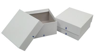 Here is the corrected text: These mechanical cryogenic freezer boxes, constructed of durable fiberboard with a protective moisture-repellent coating, are available in two and three-inch high versions. Optional fiberboard dividers can be accommodated in these boxes. VWR Freezer Boxes are compatible with most manufacturers' upright and chest freezer racks in general-purpose and ultra-low mechanical freezers. SBE: Y, 3" Mechanical Cryogenic box, no drain slots, no grids, Dimensions: 13.2L × 13.2W × 7.6H cm (5 1/8 × 5 1/8 × 3), including lid, Cat. No.: 89214-768 SBE: Y, 2" Mechanical Cryogenic box, no drain slots, no grids, Dimensions: 13.2L × 13.2W × 5.1H cm (5 1/8 × 5 1/8 × 2"), including lid, Cat. No.: 89214-764 SBE: Y, 4" Mechanical Cryogenic box, no drain slots, no grids, Dimensions: 13.2L × 13.2W × 10.2H cm (5 1/8 × 5 1/8 × 4"), including lid, Cat. No.: 89214-776