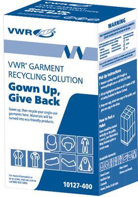 This easy-to-use recycling program provides a complete waste collection, shipment and recycling solution for used disposable apparel., All brands of disposable apparel are accepted as long as they are clean and do not harbor any contaminants, 04_BodyText: Disposable garments have been a significant waste stream to landfills and incinerators because they are made of a mixture of materials that makes them difficult to recycle. This program offers a convenient opportunity to recycle an abundant source of waste found in nearly every large pharmaceutical production facility by diverting typically hard-to-recycle products into new, permanent infrastructure with a lasting impact., 05_BodyText: The plastic waste is recycled into resin that is used to make permanent infrastructure including composite decking, railroad ties and drainage pipes., 02_BulletPoint: Comprehensive recycling solution to reduce landfill waste | Drives sustainable business practices | Portion of sales donated to the VWR® Foundation, 10_Ordering: There are now two recycling program options. Both options include return shipping. VWR® 12-Pk Recycling Option: You will receive a pack of 12 boxes, with each collection box holding up to 30 pounds of garments. Once all 12 boxes are filled, they are returned together as a full pallet. Each pallet will hold approximately 360 pounds of used garments. When the pallet is full, simply fill out the Bill of Lading copies, provided with the boxes, and call or email UPS for pick-up. VWR® Gaylord Recycling Option: You can now use your own Gaylord box to ship garments back for recycling. You will receive an envelope with instructions, signs for your own collection containers, and Bill of Lading copies for return shipping. Simply fill up a Gaylord box, place your box on a pallet for return shipping and call or email UPS for pick-up., VWR® Gaylord recycling option, Size: Use your own Gaylord box, Environmentally Preferable: Waste Reducing, Cat. No.: 470223-884, Final SAP Desc Link: 4954854, SAP Description Status: Ready, This easy-to-use recycling program provides a complete waste collection, shipment and recycling solution for used disposable apparel., All brands of disposable apparel are accepted as long as they are clean and do not harbor any contaminants, 04_BodyText: Disposable garments have been a significant waste stream to landfills and incinerators because they are made of a mixture of materials that makes them difficult to recycle. This program offers a convenient opportunity to recycle an abundant source of waste found in nearly every large pharmaceutical production facility by diverting typically hard-to-recycle products into new, permanent infrastructure with a lasting impact., 05_BodyText: The plastic waste is recycled into resin that is used to make permanent infrastructure including composite decking, railroad ties and drainage pipes., 02_BulletPoint: Comprehensive recycling solution to reduce landfill waste | Drives sustainable business practices | Portion of sales donated to the VWR® Foundation, 10_Ordering: There are now two recycling program options. Both options include return shipping. VWR® 12-Pk Recycling Option: You will receive a pack of 12 boxes, with each collection box holding up to 30 pounds of garments. Once all 12 boxes are filled, they are returned together as a full pallet. Each pallet will hold approximately 360 pounds of used garments. When the pallet is full, simply fill out the Bill of Lading copies, provided with the boxes, and call or email UPS for pick-up. VWR® Gaylord Recycling Option: You can now use your own Gaylord box to ship garments back for recycling. You will receive an envelope with instructions, signs for your own collection containers, and Bill of Lading copies for return shipping. Simply fill up a Gaylord box, place your box on a pallet for return shipping and call or email UPS for pick-up., Final SAP Desc Link: 4954854, SAP Description Status: Ready, This easy-to-use recycling program provides a complete waste collection, shipment and recycling solution for used disposable apparel., All brands of disposable apparel are accepted as long as they are clean and do not harbor any contaminants, 04_BodyText: Disposable garments have been a significant waste stream to landfills and incinerators because they are made of a mixture of materials that makes them difficult to recycle. This program offers a convenient opportunity to recycle an abundant source of waste found in nearly every large pharmaceutical production facility by diverting typically hard-to-recycle products into new, permanent infrastructure with a lasting impact., 05_BodyText: The plastic waste is recycled into resin that is used to make permanent infrastructure including composite decking, railroad ties and drainage pipes., 02_BulletPoint: Comprehensive recycling solution to reduce landfill waste | Drives sustainable business practices | Portion of sales donated to the VWR® Foundation, 10_Ordering: There are now two recycling program options. Both options include return shipping. VWR® 12-Pk Recycling Option: You will receive a pack of 12 boxes, with each collection box holding up to 30 pounds of garments. Once all 12 boxes are filled, they are returned together as a full pallet. Each pallet will hold approximately 360 pounds of used garments. When the pallet is full, simply fill out the Bill of Lading copies, provided with the boxes, and call or email UPS for pick-up. VWR® Gaylord Recycling Option: You can now use your own Gaylord box to ship garments back for recycling. You will receive an envelope with instructions, signs for your own collection containers, and Bill of Lading copies for return shipping. Simply fill up a Gaylord box, place your box on a pallet for return shipping and call or email UPS for pick-up., VWR® 12-Pk recycling option, Size: 12/Pack, Environmentally Preferable: Waste Reducing, Cat. No.: 10127-400, Final SAP Desc Link: 4954854, SAP Description Status