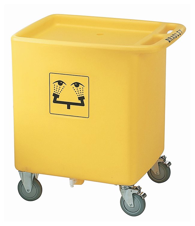 High-density, highly visible yellow polyethylene cart with molded handle for ease of transportabilityTapered sump with .5 in. petcock for easy drainage56 gallon capacityTwo rigid casters in front and 2 swivel casters with “Total Lock” brakes in backEasy to “Park” from right-or-left-side approachDual drain holes allow for alternate positioning of On-Site unitComes equipped with two clearly marked eye wash sig