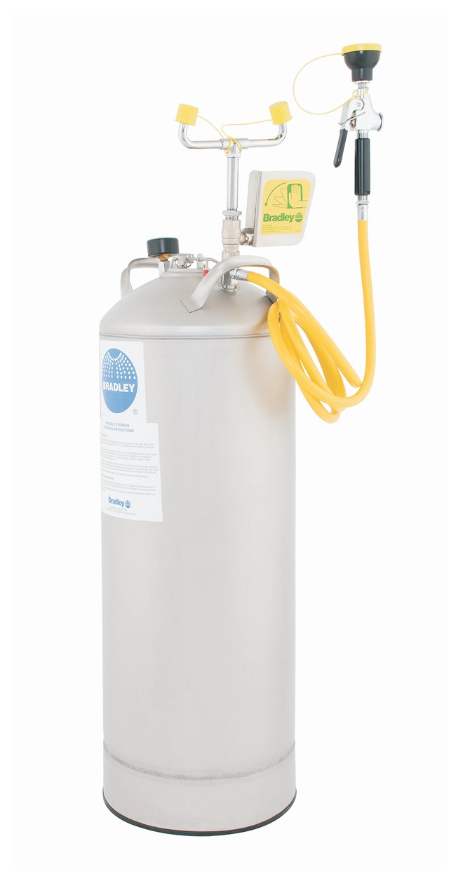 During an eye-related emergency, time is important. The Bradley Pressurized Eyewash with Drench Hose is a self-contained portable eyewash station that provides an immediate supply of flushing liquid.