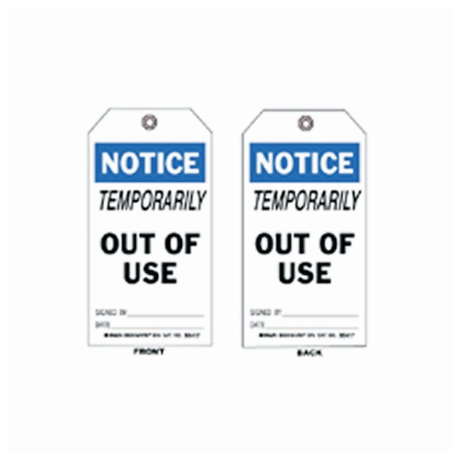 Feature two chamfered corners and a 3/8 in. grommeted holeTextured write-on surface allows for authorized signatures, dates, and other special instructionsChemical-resistant, plastic Dura-Tags are reusable and designed for harsh plant environments; come with nylon fastenersChemical-resistant economy polyester tags withstand moisture, grease and dirt; come with nylon fastenersEconomical, yet durable cardstock tags come with string fastenersComplianceMeet OSHA 1910.145 for accident prevention; Dura-Tag and polyester tags also meet OSHA 50 lb. pull requirement.