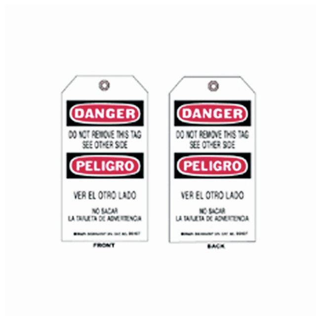 Feature two chamfered corners and a 3/8 in. grommeted holeTextured write-on surface allows for authorized signatures, dates, and other special instructionsChemical-resistant, plastic Dura-Tags are reusable and designed for harsh plant environments; come with nylon fastenersChemical-resistant economy polyester tags withstand moisture, grease and dirt; come with nylon fastenersEconomical, yet durable cardstock tags come with string fastenersComplianceMeet OSHA 1910.145 for accident prevention; Dura-Tag and polyester tags also meet OSHA 50 lb. pull requirement.