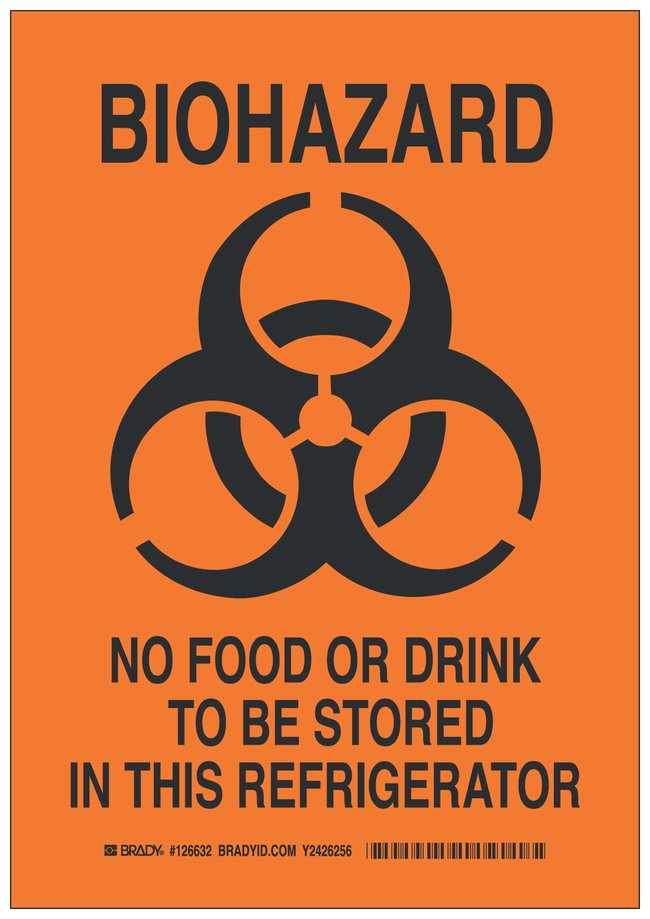 Aluminum Caution Sign: BIOHAZARD NO FOOD OR DRINK TO BE STORed IN THIS REFRIGERATOR, Each