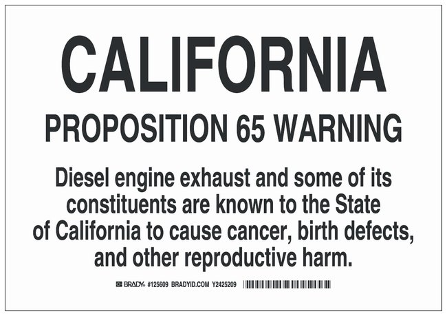 Aluminum Caution Sign: CALIFORNIA PROPOSITION 65 WARNING DIESEL ENGINE EXHAUST AND SOME … CAUSE CANCER, BIRTH DEFECTS, AND OTHER REPRODUCTIVE HARM, Each
