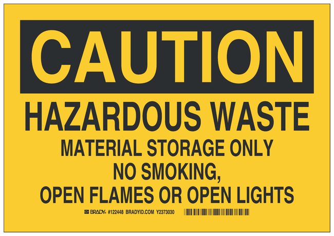 Aluminum Caution Sign: HAZARDOUS WASTE MATERIAL STORAGE ONLY NO SMOKING, OPEN FLAMES OR OPEN LIGHTS, Each