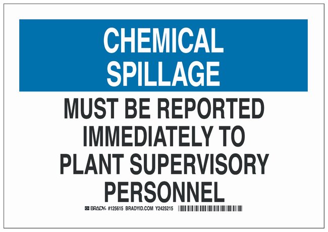 Aluminum Chemical spillage Sign: MUST BE REPORTED IMMEDIATELY TO PLANT SUPERVISORY PERSONNEL, Each