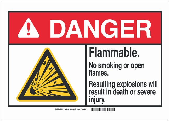 Aluminum Danger Sign: FLAMMABLE. NO SMOKING OR OPEN FLAMES. RESULTING EXPLOSIONS WILL RESULT IN DEATH OR SEVERE INJURY, Each