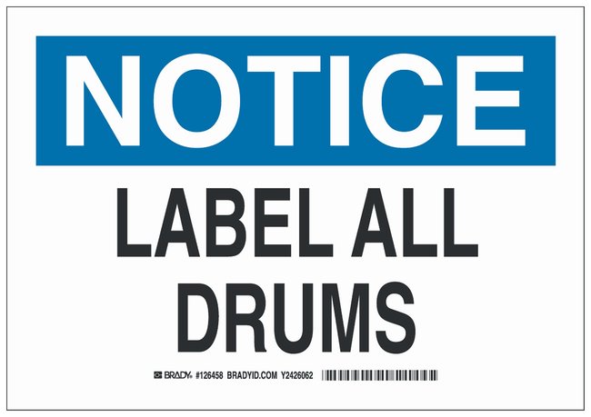 Aluminum Notice Sign: LABEL ALL DRUMS, Each