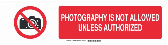 Aluminum Safety Sign: PHOTOGRAPHY IS NOT ALLOWED UNLESS AUTHORIZED, Each