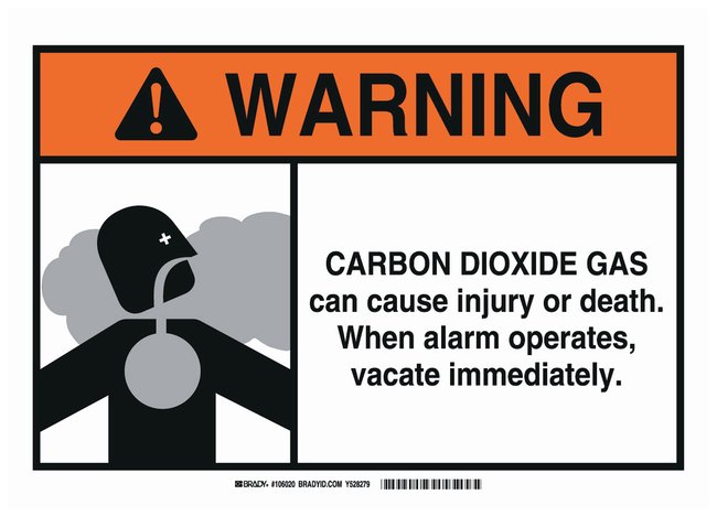 Aluminum Warning Sign: CARBON DIOXIDE GAS CAN CAUSE INJURY OR DEATH. WHEN ALARM OPERATES, VACATE IMMEDIATELY, Each