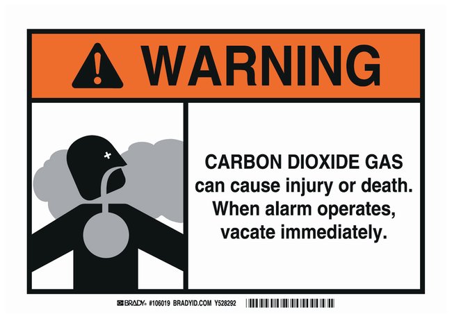 Aluminum Warning Sign: CARBON DIOXIDE GAS CAN CAUSE INJURY OR DEATH. WHEN ALARM OPERATES, VACATE IMMEDIATELY, Each