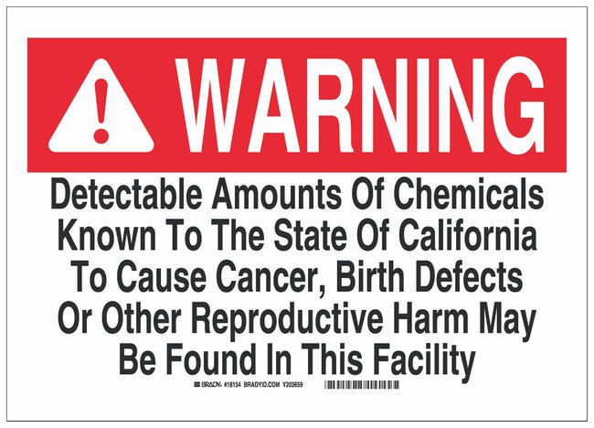 Aluminum Warning Sign: DETECTABLE AMOUNTS OF CHEMICALS KNOWN TO THE STATE OF CALIFORNIA TO CAUSE CANCER, BIRTH DEFECTS OR OTHER REPRODUCTIVE HARM MAY BE FOUND IN THIS FACILITY, Improve workplace safety with proper signage. The Warning Sign is a durable, clear and effective tool to properly mark appropriate areas and to help prevent workplace injury, Each